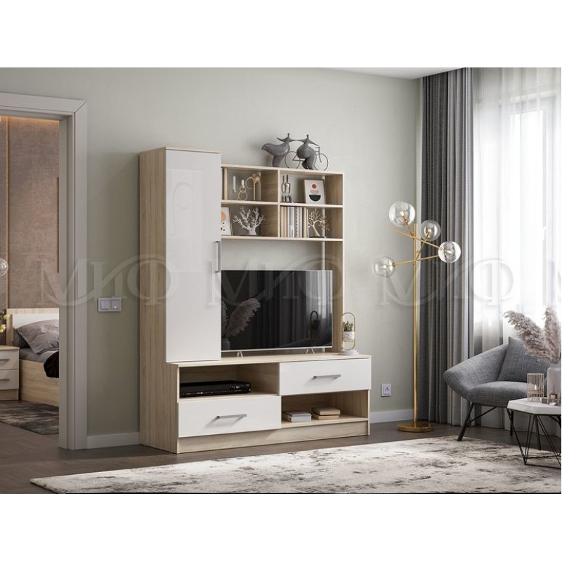 Тумба под ТВ арт.24.123 фасад ЛДСП белый глянец /каркас ЛДСП дуб сонома 1500х520хh1892мм (ниша под ТВ 1084х792мм) Мартина